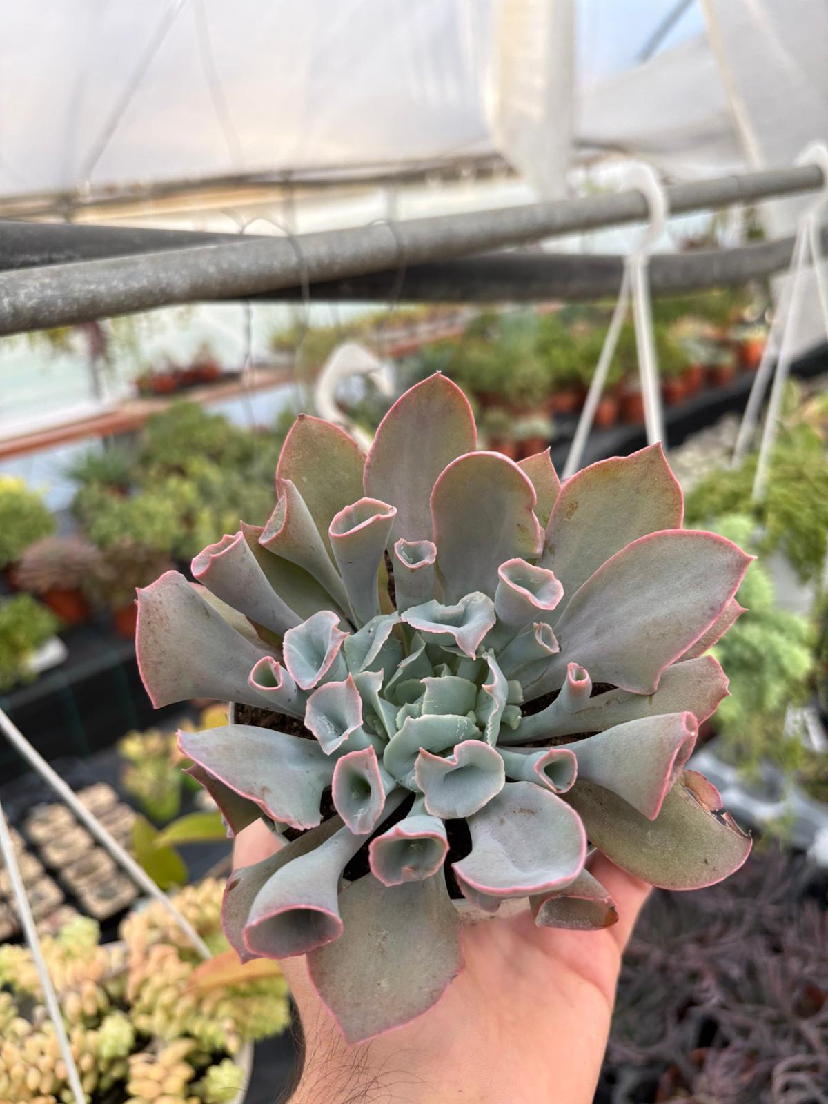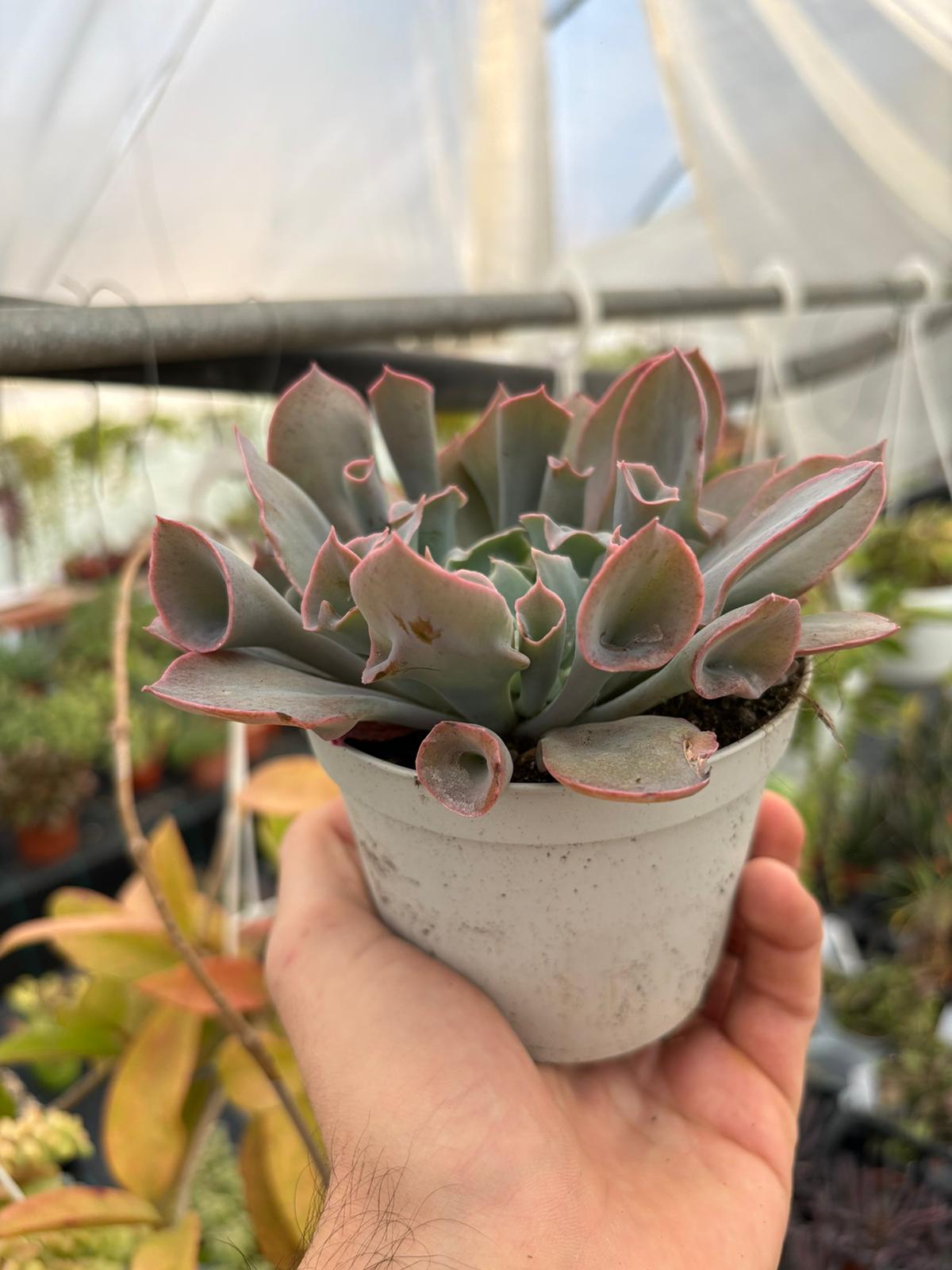 Echeveria “Trumpet Pinky” è una succulenta ornamentale molto particolare, nota per le sue foglie tubolari e svasate all’estremità, simili a piccole trombe. La rosetta può raggiungere dimensioni medio-piccole e presenta un colore che varia dal verde glauco al rosa delicato, soprattutto se esposta a luce intensa. È una pianta compatta, ideale per collezioni, composizioni e piccoli vasi decorativi. Produce talvolta fiori su steli sottili, con tonalità aranciate o rosate. Preferisce un’esposizione luminosa, anche sole diretto nelle ore meno calde. Richiede terriccio ben drenante e irrigazioni moderate, lasciando asciugare completamente il substrato. È relativamente resistente, ma teme ristagni idrici e gelate. La crescita è lenta ma ordinata, mantenendo nel tempo la sua forma caratteristica. Una scelta perfetta per chi ama succulente insolite e scenografiche.