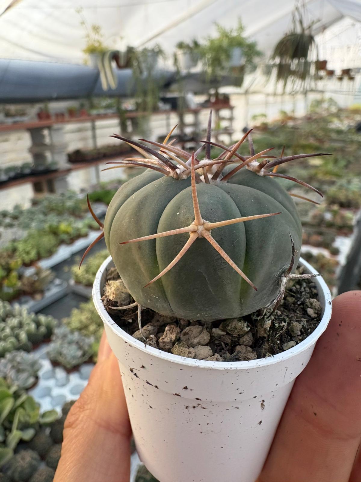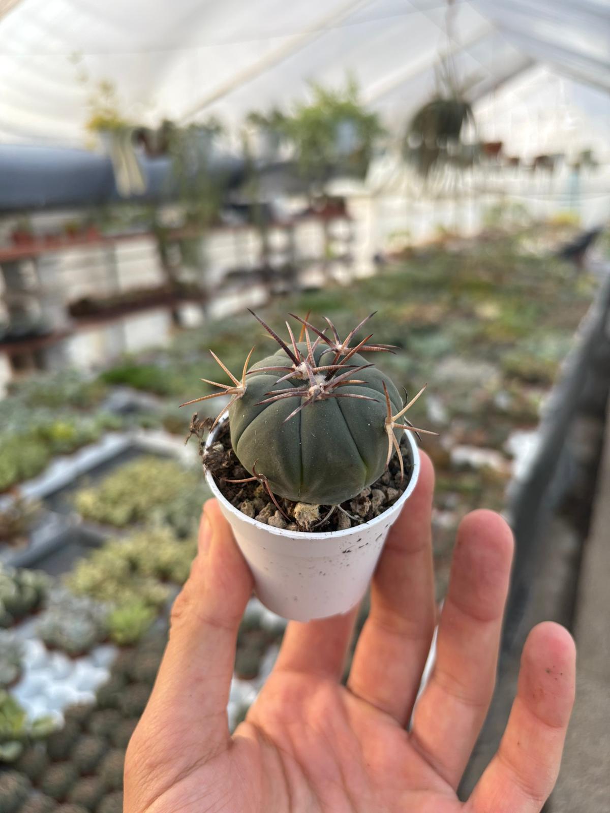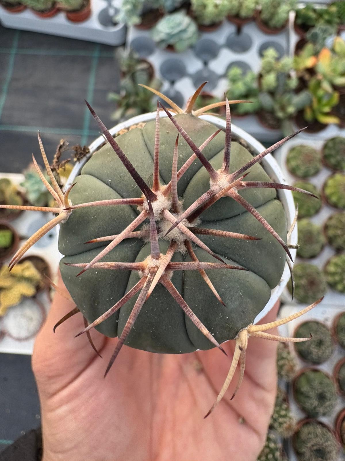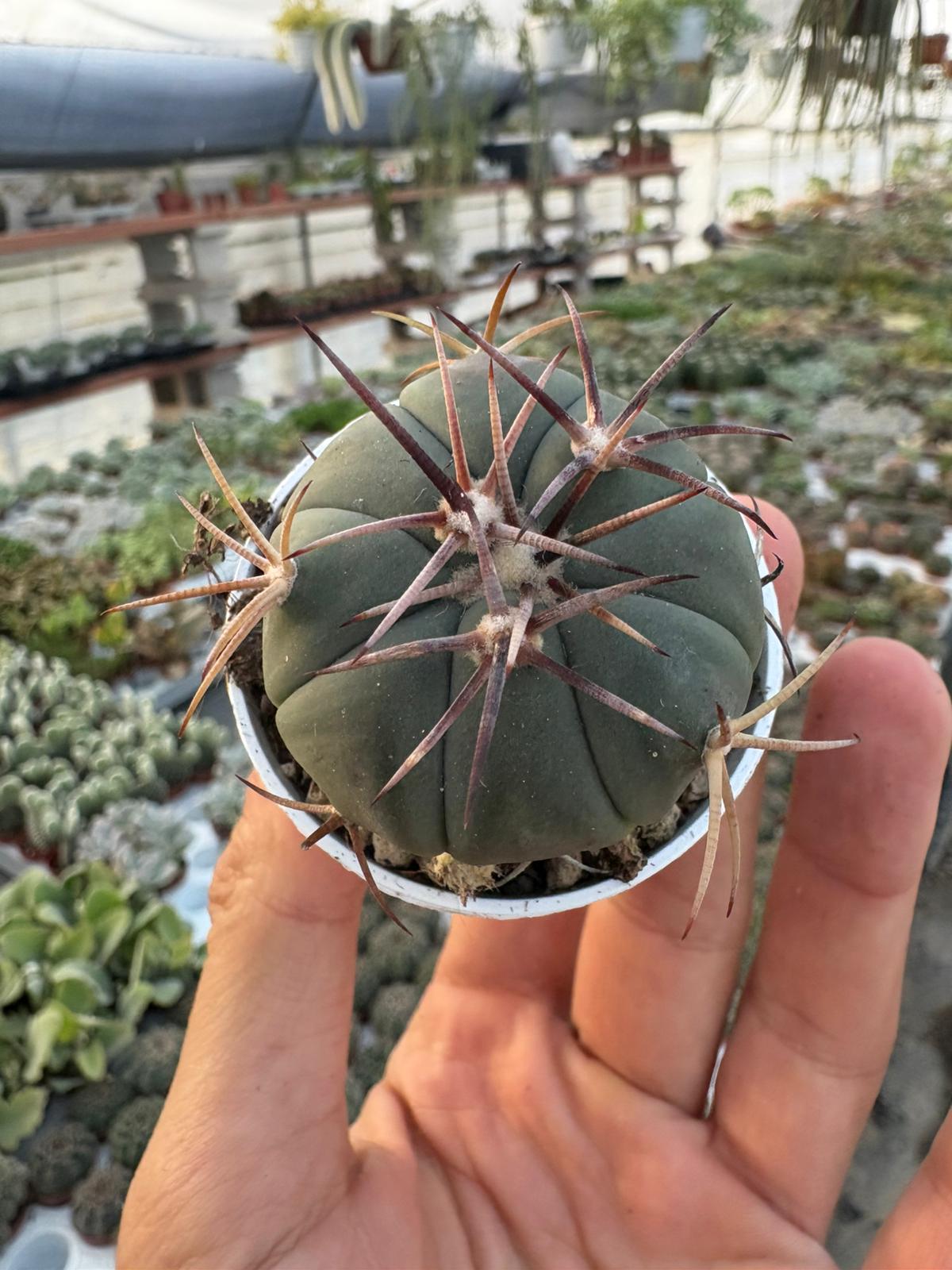 Un cactus raro e affascinante, noto per la sua forma globosa e il caratteristico colore verde-blu. Crescita lenta, perfetto per collezionisti. Presenta costolature marcate e poche spine eleganti, che con il tempo assumono tonalità avorio. In primavera produce splendidi fiori rosa-magenta che sbocciano al centro della pianta.