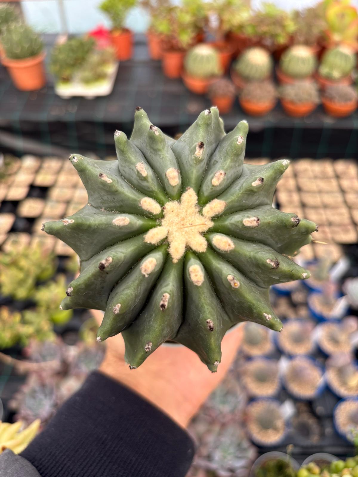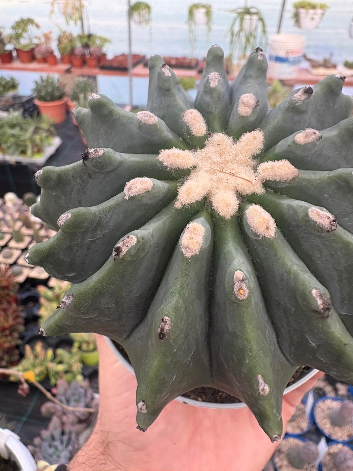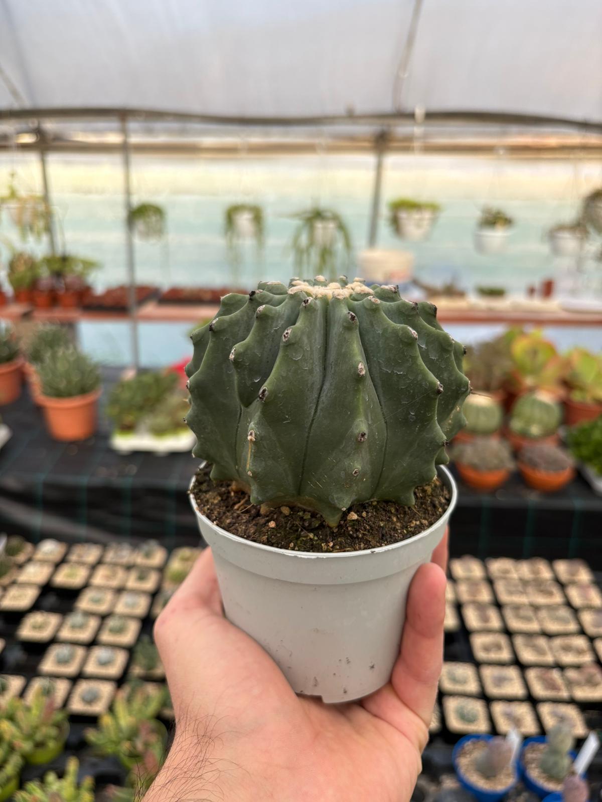 Ferocactus glaucescens inermis è una forma senza spine del cactus messicano dal fusto globoso e verde glauco. Ha costolature regolari, superficie liscia e fiorisce in estate con piccoli fiori gialli sull’apice. Cresce lentamente, richiede molta luce, un terreno molto drenante e annaffiature rare.