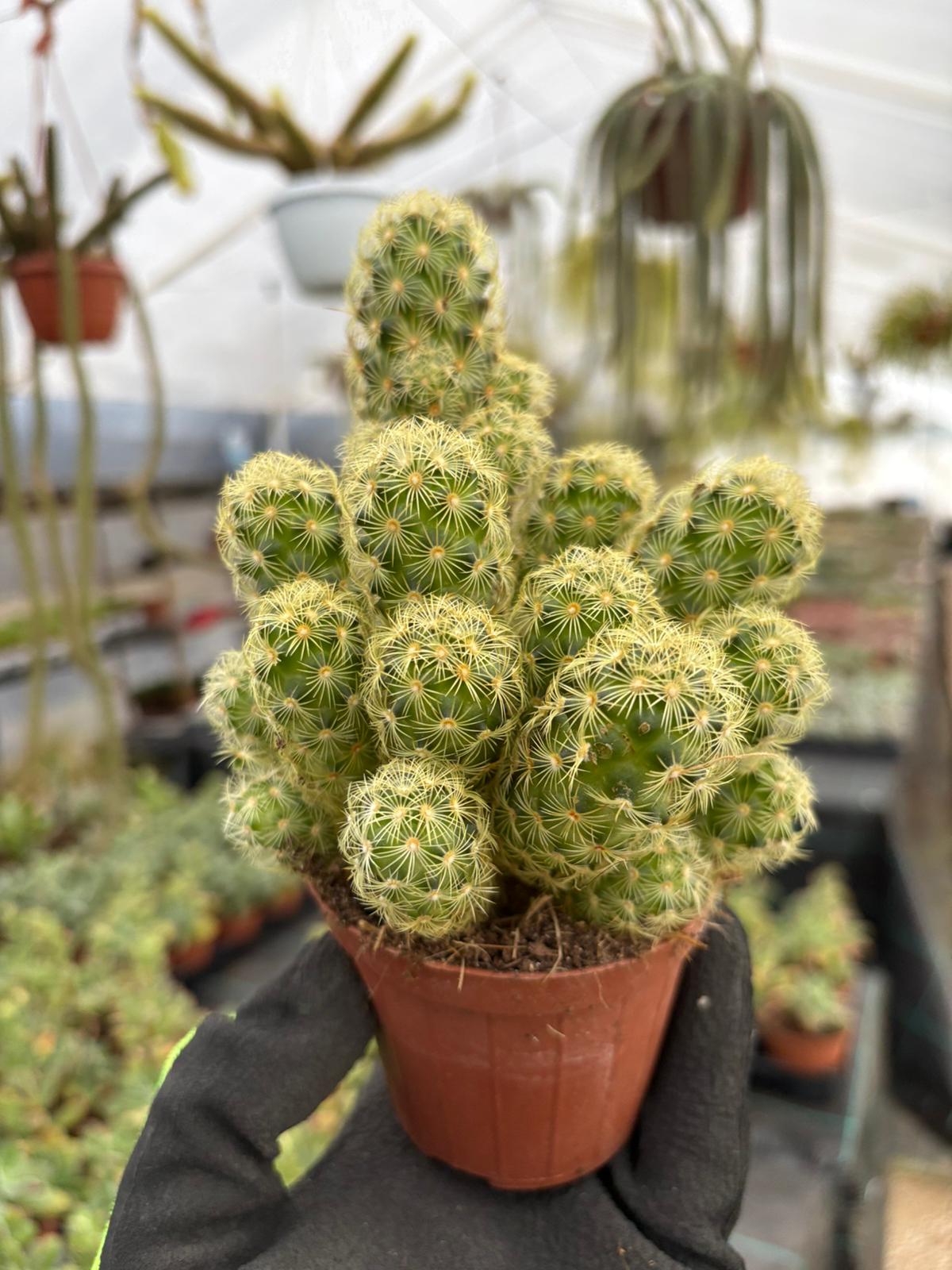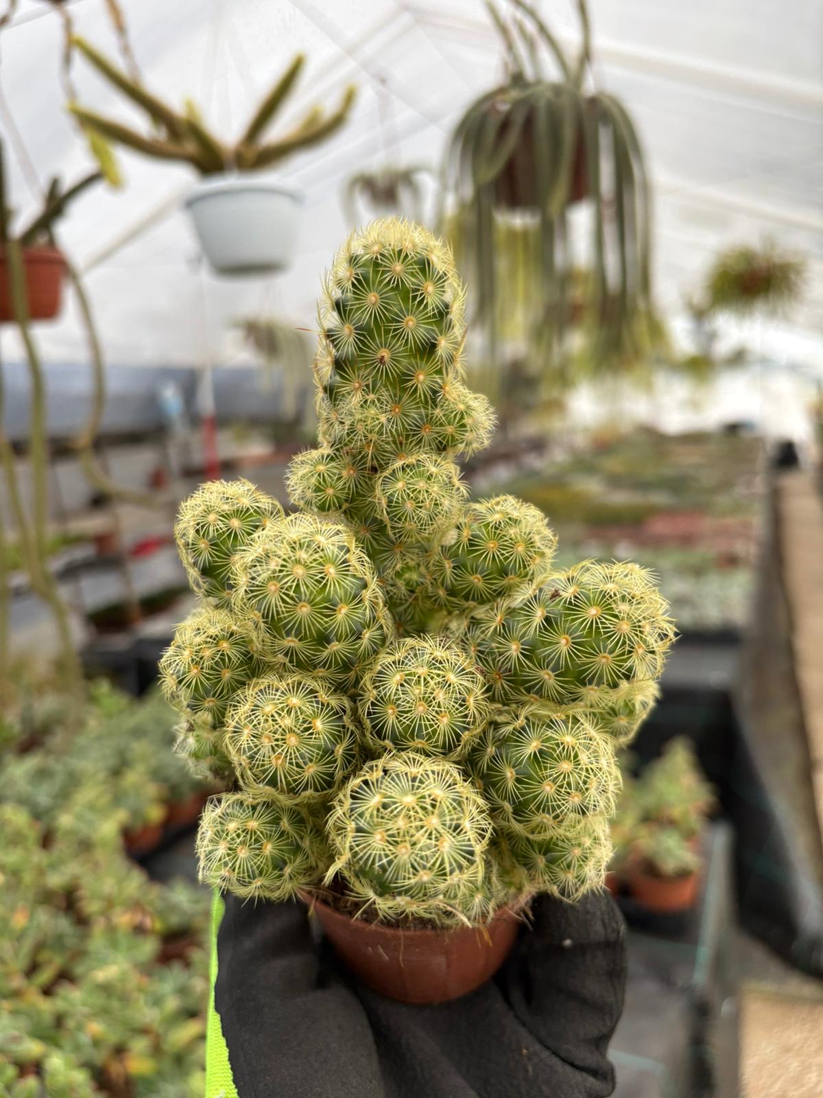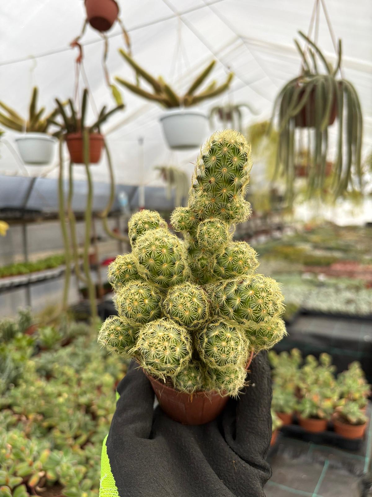La Mammillaria elongata è un cactus originario del Messico, caratterizzato da un fusto cilindrico e ramificato che può raggiungere i 30-40 cm di altezza. Il suo fusto è verde chiaro, con costolature evidenti e spine sottili di colore giallo o bruno. Produce piccoli fiori tubulari rosa o rossi, che fioriscono in primavera e estate. Preferisce terreni ben drenati e un’esposizione solare diretta, anche se tollera un po’ di ombra. L’annaffiatura deve essere moderata durante la crescita, riducendola in inverno. È facile da coltivare come pianta da appartamento e apprezzata per la sua bellezza e resistenza.
